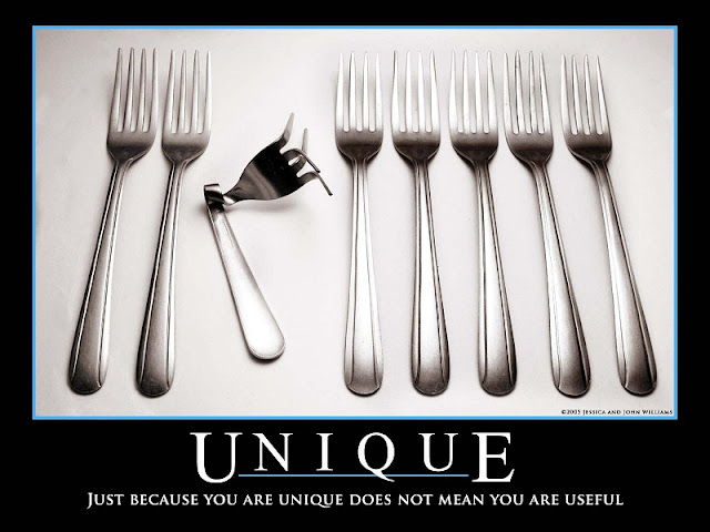 While individualism is praised in the private sector, people aren't as unique as they think they are. They are very unique....just like everyone else. No really I mean, what's around that hasn't been around before? What is "unique" anyways? Unique is very subjective and contextual when you think about it. I mean, here in Portland, the way I dress and live (shirt, tie, suspenders, shoes shined, nice business or military haircut...oh and I'm white...I don't smoke maryjane, inhaled it once as part of my training as an MP (I'm not joking) and I don't sleep around or talk about it or feel a need to talk about it in a public setting (if you think I'm joking, you haven't lived in Portland)) I could be considered relatively "unique" around here. I'm "anti establishment" (the establishment of Portland anyways).