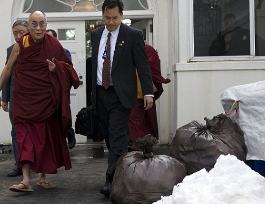 Meanwhile he hasn't befriended a single country in the world. Leads the Dali Lama out past the trash.