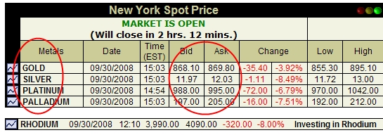 When you look a price chart there are two prices: "bid" and "ask." You'll notice that the "ask" price is higher than the "bid." The "ask" price is the price you will pay if YOU are BUYING the precious metal from the company. The "bid" price is the current price a COMPANY is buying the metals for. The actual current value of the metal (or SPOT price) is right in between these two prices. So if you see a website that only lists one price for them, it is the price between the "bid" and "ask" price.