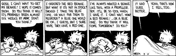 Calvin and Hobbes is just a classic from growing up, Baby Blues used to be funny until I had kids and found out it was "nonfiction," now it's only sort-of-funny, still enjoy Garfield, and with Pickles, I can't wait to be the eccentric old man in the family.