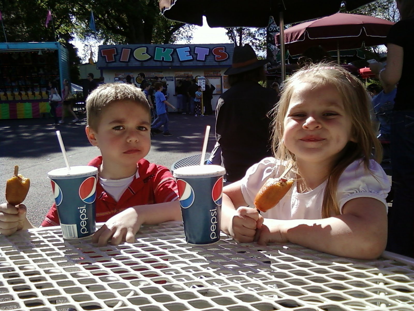 Kidlets with a glare and a goofy smile enjoying a hot dog at Oaks Park before the ride back....