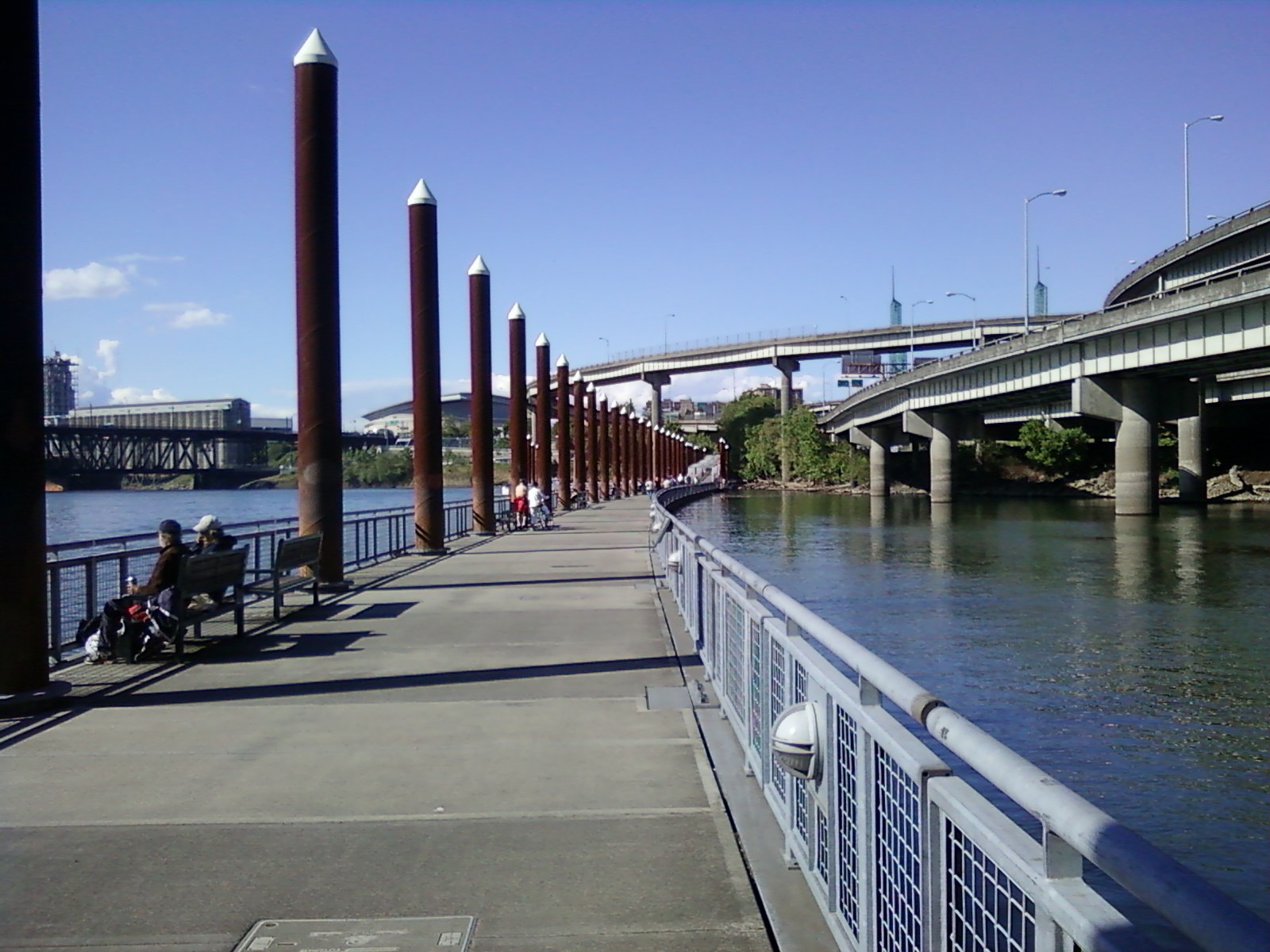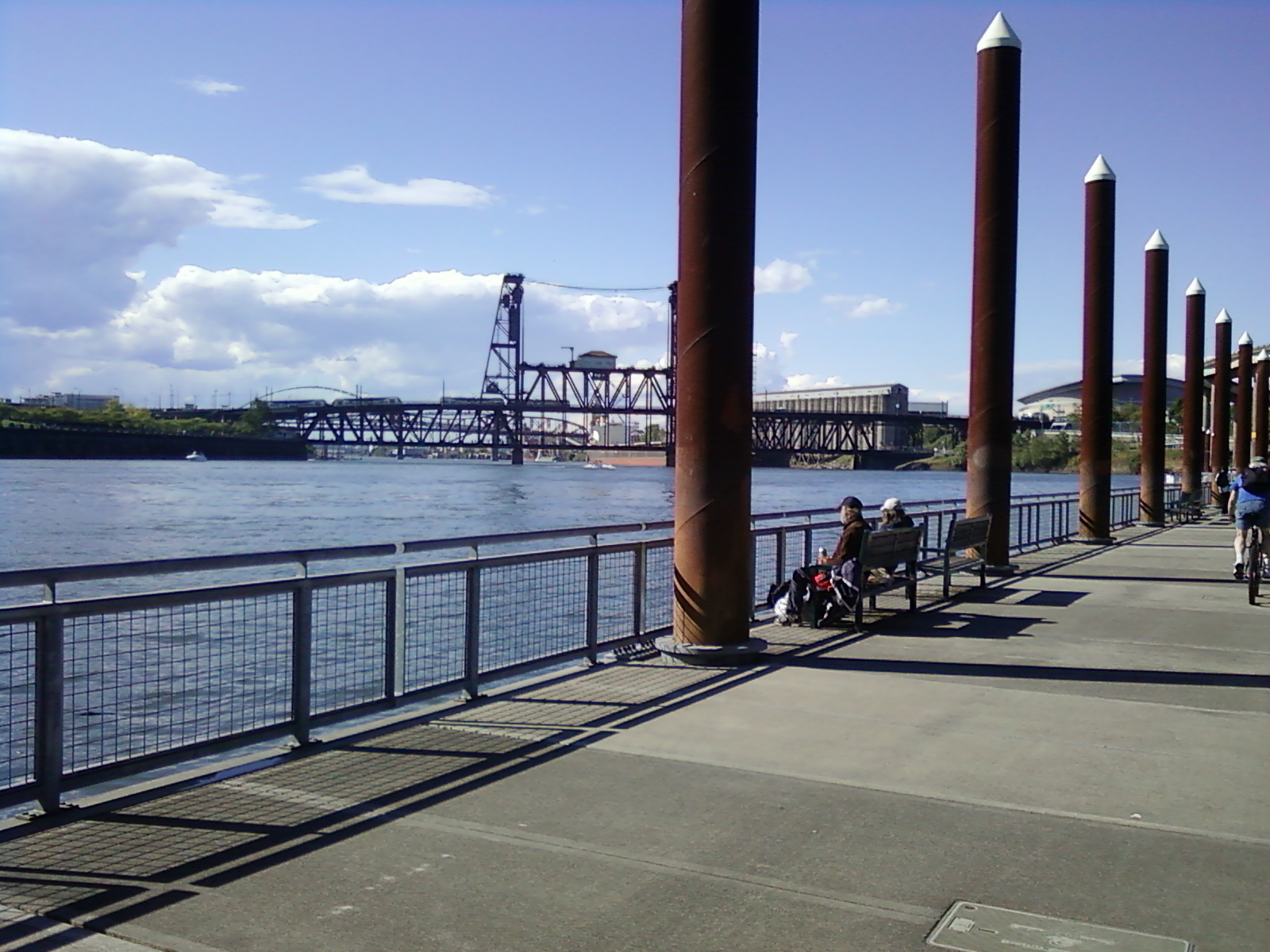 Bike Path down on the Willamette (Wih-LAM-et) river with the Steele Bridge in the background.